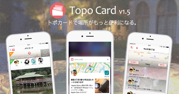 Topo Cardは、宛先と場所を指定したカードを送っておくと、その場所に着いた時に通知とともにカードが表示されるiPhone向けの無料アプリケーションです。ひとつのカードに地図と写真・動画、テキストを簡単にまとめられ、ユーザー同士がメッセンジャー感覚でやり取りできます。また、SNSを通じてネット上に広く公開できる機能も備えているので、ショップカードとして同じ街にいる人達へ共有したり、地域のフリーペーパーのように街の情報を束ねることも、Topo Cardでは簡単に行えます。