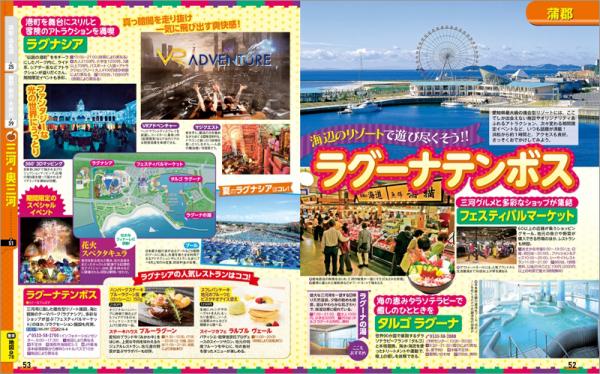 浜松・浜名湖エリアの周辺にも魅力的なスポットがいくつもあります。愛知県最大級の複合型リゾート「ラグーナテンボス」(蒲郡)が浜松から約1時間ほどのところにあるほか、掛川、大井川鐵道、寸又峡、豊川稲荷、豊橋、渥美半島、岡崎、香嵐渓など静岡から愛知にまたがる広域の観光スポットも漏らさず収録しており、これ一冊であらゆるジャンルの観光を楽しむことができます。