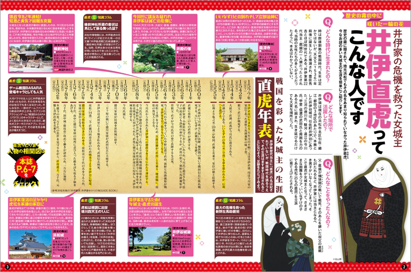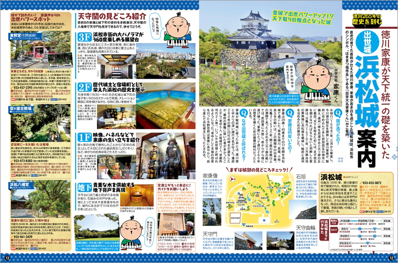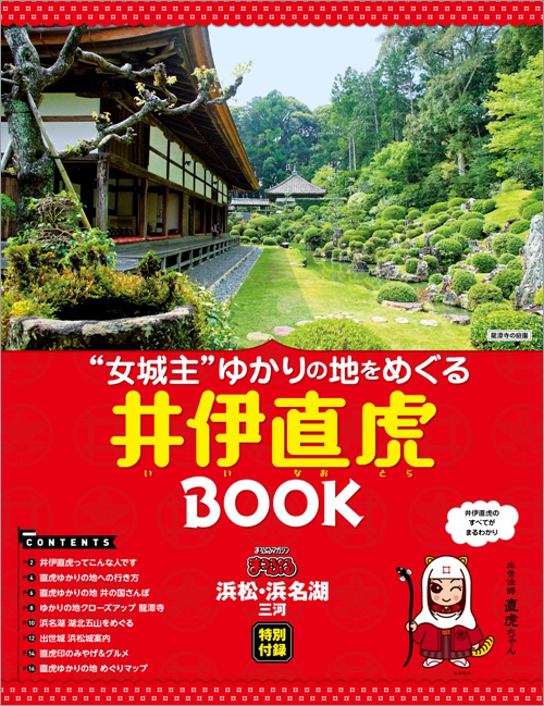 全16ページの巻頭付録では、徳川家康が若き日を過ごした<出世城>として名高い「浜松城」、井伊家の菩提寺「龍潭寺」、国指定の重要文化財を有する浜名湖「湖北五山」の寺院群などゆかりの地を、浜松市を代表するゆるキャラの「出世大名 家康くん」「出世法師 直虎ちゃん」が徹底解説しています。
