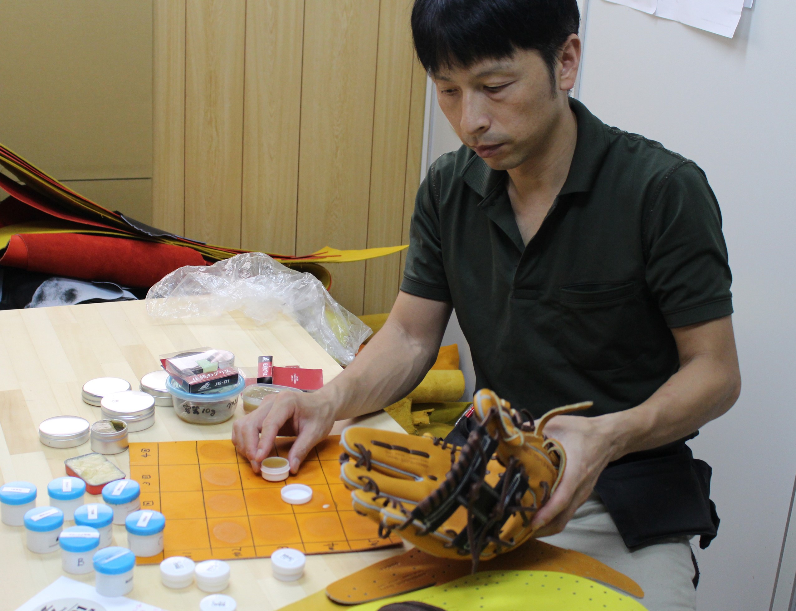 もともとこの「伝統のグリス」は「70周年記念モデル」の規定ロット数分の分量しか存在せず、『ジュンケイ-グラブのレギュラーオーダーグラブにも、「伝統のグリス」を使用してほしい』という多くのお客様のご要望に対応するため開発したものです。グラブグリスの本当の役割は捕球面の接着剤ではありません。本来グリスの役割はグラブの革に保革成分として浸透させ強度を上げるという役割のためにあります。