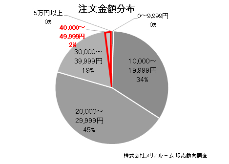 今回の調査期間中の平均購入単価は「23,702円」。商品購入金額の構成比を調査(円グラフ参照)すると、平均単価を上回る4万円以上の購入が全体の2%を超える結果となりました。