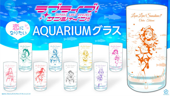 恋になりたいAQUARIUMのワンシーンをモチーフにした、Aqoursメンバーと水槽をイメージしたデザインがプリントされたグラスです。
