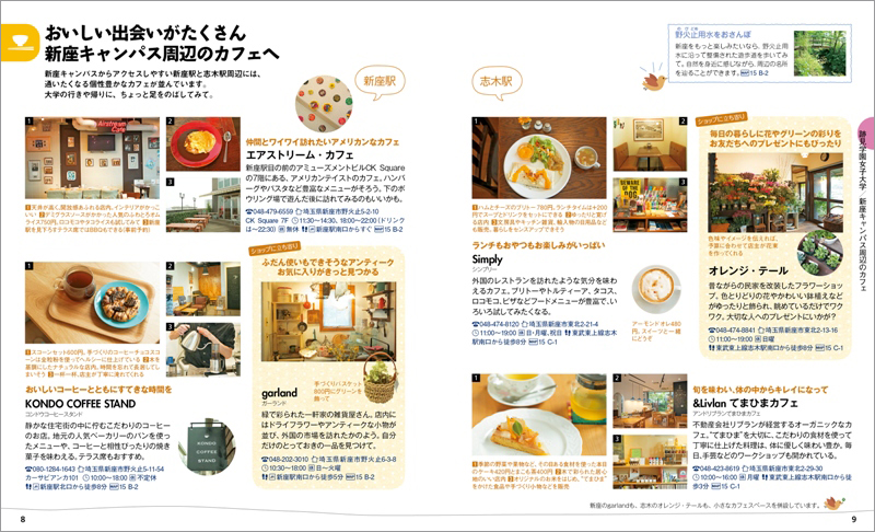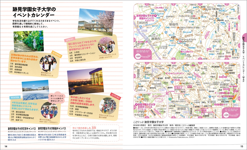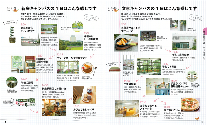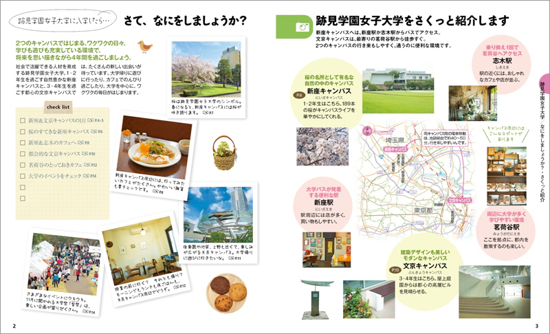 桜の名所としても知られ、自然のなかで落ち着いて学べる新座キャンパス(1・2年)、都心のスタイリッシュな建物で学べる利便性の高い文京キャンパス(3・4年)での1日の過ごし方や充実した施設を紹介。将来を思い描く場となるキャンパスの魅力を伝えます。さらに通学時に行きたくなる周辺のカフェ、レストランなどを「ことりっぷ」目線でセレクトしました。大学の年間イベントカレンダーや周辺地図も掲載し、オープンキャンパスなどで訪れる際だけでなく、入学後もガイドブックとして使える冊子となっております。