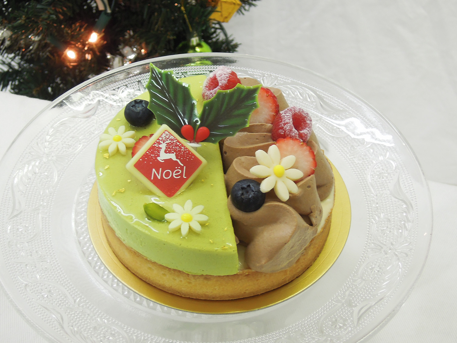 「ダマンドとカシスの入ったタルト生地の上にピスタチオのムースをのせ、ディプロマットとチョコレートのシャンティで仕上げました。」