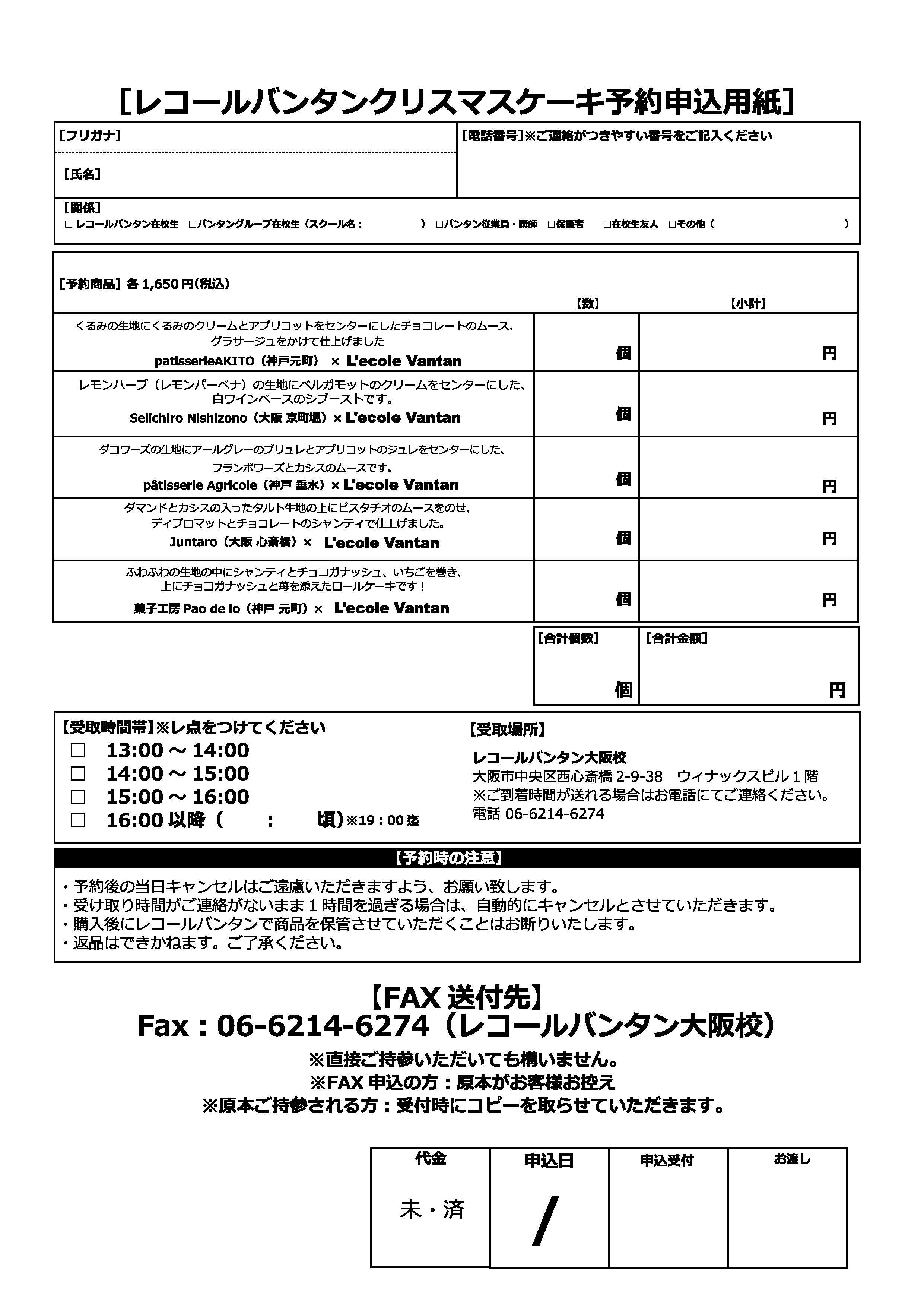 今回のクリスマスケーキの販売は、2016年12月19日(月)レコールバンタン大阪校にて実施致します。当日売り切れてしまう可能性もありますので、12月15日(木)までTEL・FAXにての事前予約受付も致します。