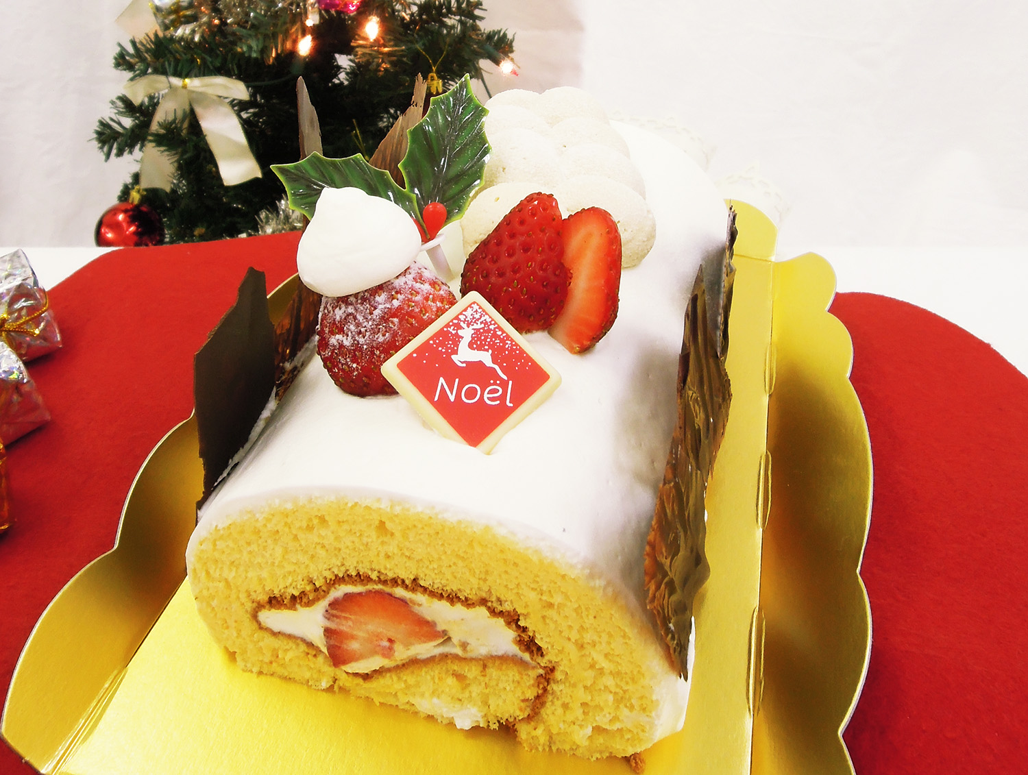 「ふわふわの生地の中にシャンティとチョコガナッシュ・苺を巻き、さらに上にチョコガナッシュと苺を添えたロールケーキです!」