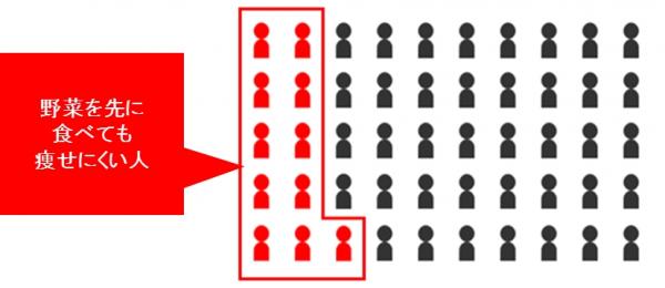 痩せやすい食べ順として、現在一般的に知られているのは「野菜ファースト(野菜を最初に食べること)」ですが、今回の調査の結果、実は日本人の約5人に1人(22%)は「野菜ファースト」を心掛けても痩せにくい遺伝子を持っている可能性が高いことが分かりました。