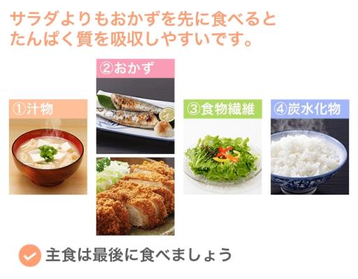 該当遺伝子を持つ人は、たんぱく質を吸収しにくい体質であるため、野菜を先に食べてしまうと、その次に摂取するたんぱく質を十分に吸収できません。まずは野菜より先に、たんぱく質が多く含んだ「おかず」を食べ、たんぱく質をしっかりと吸収する必要があります。この食べ順を心掛けることで、筋肉がつきやすく太りにくいカラダづくりができるようになるのです。