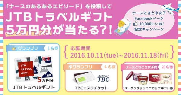 賞品: グランプリ:JTBトラベルギフト(5万円分) 1名様、準グランプリ:TBCエステチケット 4名様、ナースときどき女子賞:ハーゲンダッツミニカップギフト券 20名様