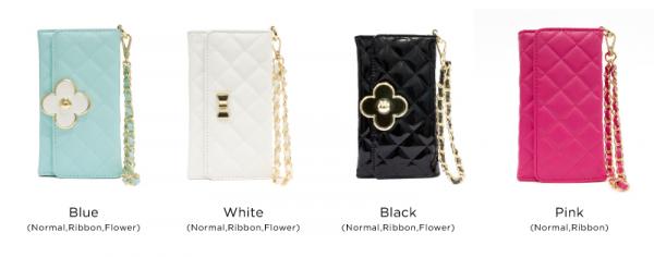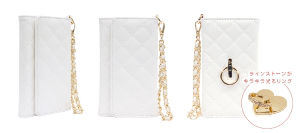 「Multi book case+Cristal ring stand」は女性に人気のあるキルティングタイプのエレガントな手帳型ケースで、ラインストーンが散りばめられた煌びやかなハート型のフィンガーリングと、ゴールドチェーンの豪華なハンドストラップがセットになっています。