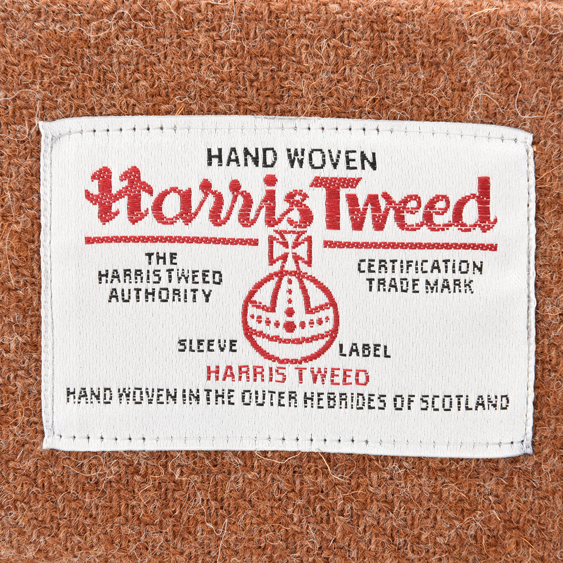 後頭部には、厳しい品質基準をクリアした合格品の証であるハリスツイードおなじみの「認定ラベル」つき。ロンドンのハリスツイード協会より英国王室からの使用が許可された宝玉マークが印象的だ。