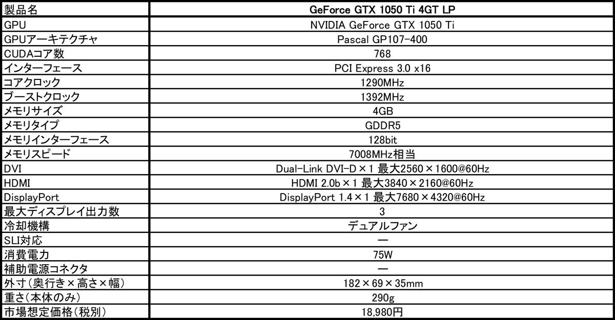 GeForce GTX 1050 Ti 4GT LPの主な仕様は下記のとおりです。