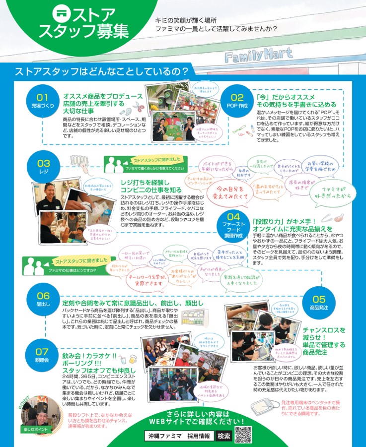 そしてこの度、沖縄ファミリーマートとプレイスメントパートナーとして提携することで、県内のファミリーマート313店舗においてマガジンを展開。入口付近にある雑誌ゴンドラにおいて毎月無料配布することで、コンビニを頻繁に利用する県内若者層をターゲットとして取り込み、沖縄経済の魅力拡散を目指します。また、マガジン冊子は両A面形式となっており、背表紙を含めた数ページはプレイスメントパートナーの専用ページとして、沖縄ファミリーマートの仕事紹介を掲載。専用ページではストアでの業務内容や職場の雰囲気を紹介しており、採用活動の強化や既存スタッフの満足度向上を図っています。