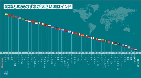 今回の調査結果を見ると人々が抱いている認識と現実のずれは、国によっての傾向がある。イプソスが独自に算出した指数では、現実を正確に認識している国はオランダ、次いでい英国、韓国と続く。日本は40か国中、14番目であった。
