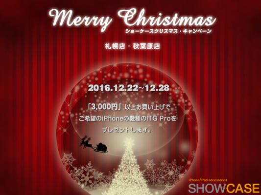 SHOWCASE(運営会社:株式会社 KODAWARI)は、12月22日から12月28日までクリスマスプレゼントキャンペーンをSHOWCASE秋葉原本店、SHOWCASE札幌ル・トロワ店で行います。期間中、3000円以上商品をお買い上げのお客様にお持ち込みの端末に合う高品質ガラスフィルムITG PROをプレゼント致します。