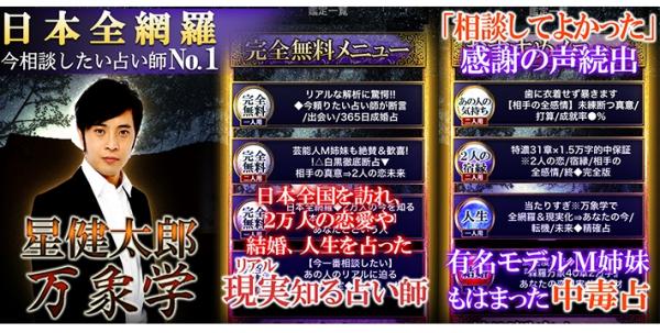 日本全国を網羅。2万人のリアルを知る今、一番相談したい占い師≪星健太郎≫。日本全国を訪れ、2万人の恋愛や結婚、人生のリアルを占った星健太郎だからこそできる、心内まで知る鑑定をあなたの目でお楽しみください。他の占いと違う。現実味ある占いにリピーター激増!“今最も予約が取れない”占いをあなたの目でお確かめください。