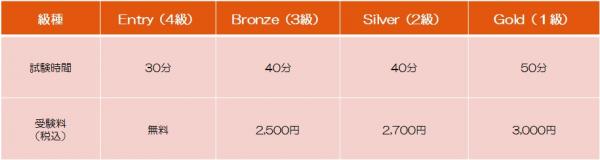 ○受験料 :Entry(4級)…無料、Bronze(3級)…2,500円、Silver(2級)…2,700円、Gold(1級)…3,000円