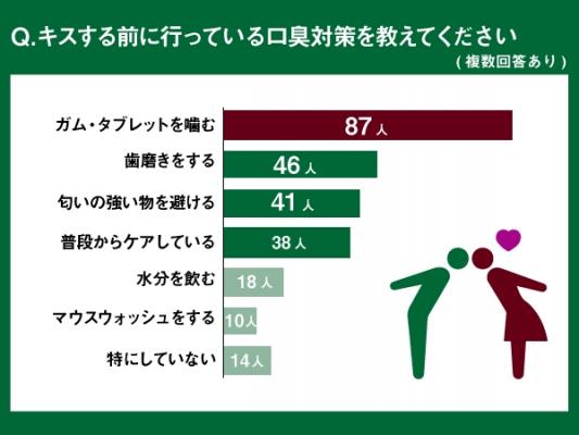 キスする前に行う対策はガム・タブレットを噛むが35%(87人)を占める結果になりました。