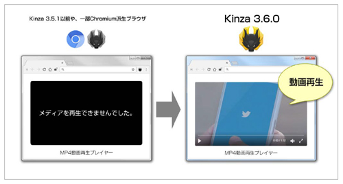 Kinzaは、2014年5月の初版リリース以降、ユーザーからのフィードバックを受けて開発内容を定める「ユーザーファースト」の姿勢を維持することにより、日本国内のパワーユーザーを中心とした支持を得てきました。これまでのバージョン(3.5.1以前)では、主に動画共有サイトやソーシャルメディアにて配信されている動画や音声について再生できないケースがあり、これが普段使うブラウザとしての問題点となっていたことから、『MP4・MP3ファイルをブラウザ上で再生できる機能』の要望がユーザー数の増加に伴い大きくなっていました。