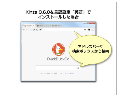 言語設定を「英語」にてインストールした際に、アドレスバー及びスタートページから利用できるデフォルトの検索エンジンとして「DuckDuckGo」を新規実装いたしました。これにより既存の利用者数が多い日本国内だけではなく、来年以降は、海外での利用者獲得を目指しKinzaの国際化をさらに推進して参ります。