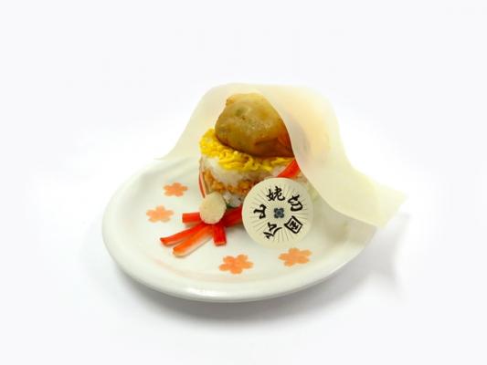 山姥切国広のトレードマークである布をイメージして、大豆シートを被せました。中は美しいちらし寿司です。
