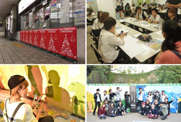-上段左: クリスマスイメージポスター駅構内掲示/ 上段右・下段左: 制作中の学生/ 下段右: 完成時集合写真-