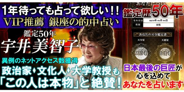 1年待っても占ってほしい!と銀座で絶賛される占いをあなたはご存知ですか?。鑑定歴50年。銀座のVIP達が推薦する的中占いがあなたのお手元にやってきます。政治家、文化人、大学教授が「この人は本物」と口をそろえて話す『宇井美智子』の秘蔵鑑定をお楽しみください。『天令術』という特別な鑑定法を用いてあなたの現実に迫ります。