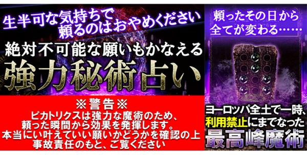 特別鑑定は40メニュー以上。本魔術はその的中力により、かつてはヨーロッパ全土で禁止されました。そのくらい本魔術は高い的中力を持つのです。あなたが強い望みを持つのなら……その望みをかなえていきます。本当に叶えて良いのか、もう一度確認をして、自己責任をもって、魔占にお触れください。