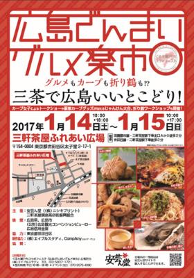 今回のぐるり瀬戸内コラボフェスタ『広島ざんまいグルメ楽市』は、お好み焼き、牡蠣の土手鍋風からめうどん、カキフライ、牡蠣鍋、汁なし担担麺、一夜干しホルモンなどの名物料理から、もみじ饅頭、地酒等を出展し、made in 広島の素晴らしさをご紹介いたします。また、カープ女子サミットin三軒茶屋、ローカルアイドルI LOVE U@あいりと月山翔雲のLIVE、マネケン x 宮脇静香(MMJ)のトークショー、三茶そぞろ歩き、ヴェートーベン お笑いLIVE、広島出身の元フジテレビアナウンサー山中秀樹さんトークショー、ザ・ギース尾関高文さん「やっぱりカープが好きじゃけん」出版記念トークイベントなどを企画しています。是非この寒いこの季節に広島の味覚とイベントをお楽しみください。