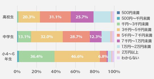 小学生は67%が千円未満と回答。中学生は千円から3千円、高校生は3千円から7千円がボリュームゾーンとなっている。高校生のうち10%弱は1万円以上と回答。