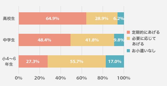 子どもの年齢が上がるにつれ、お小遣いを定期的にあげる割合が増える。「お小遣いなし」という家庭は少数で、定期不定期を問わないのであれば、8割以上の家庭がお小遣いを与えている。