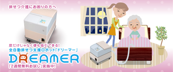 『自動排泄支援ロボット:ドリーマー』は介護保険でレンタルが可能な、最新型自動排泄処理装置です。介護用オムツの様に装着するだけで、排泄物(尿・便)を吸引し、さらには洗浄・乾燥・除湿を全自動で行うトイレ介護の新しいカタチを実現した介護ロボットです。