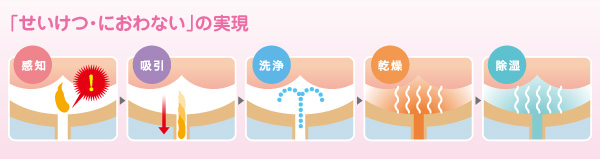 1.尿だけでなく、便も吸引。排泄後は洗浄・乾燥・除湿をサポート