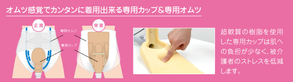 超軟質の素材の専用カップはオムツの様に装着して、動くことが可能です。ご利用者の方は、夕食後に装着されて翌朝のヘルパーさんがいらっしゃる時間までの夜間使用されてる方が多くいらっしゃいます。付け心地に関してもご好評の声を頂いております。