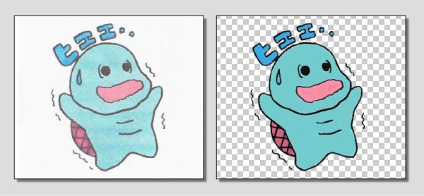 普通用紙に描かれた手描きイラストを元に、「背景透過」や「色調整」などデジタルツールでの処理や「説明文英訳」といった登録作業のお手伝いをいたします。