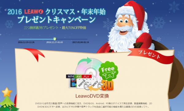 クリスマスや新年は家族が集まる祝日です。そしてプレゼントを交換する時期です。家族や友達、そして色んな店からもプレゼントを貰えます。日頃のご愛顧に感謝の気持ちを込めまして、Leawoソフトウェアは2016年12月19日から2017年1月14日までは、弊社のクリスマス・年末年始感謝祭を行います。更に、2016年12月27日から2017年1月3日までの限定期間で、世界中の顧客様へ「DVD変換」を、2016年年末年始プレゼントとして無料提供させていただきます。