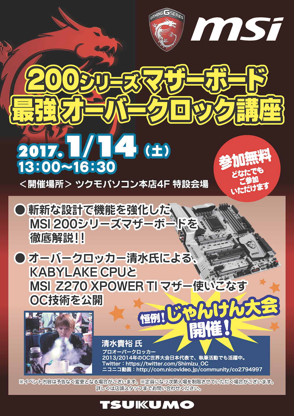イベントの各部終了時には、MSIグッズが当たる恒例のじゃんけん大会を開催いたします。また、イベント当日および翌日曜日にツクモ各店舗にてMSI 200シリーズマザーボードを10%割り引き販売するほか、ツクモパソコン本店・ツクモDOS/Vパソコン館・TSUKUMO eX.にてZ270 XPOWER GAMING TITANIUMをご購入の先着10名様にCorsair製DDR4 8GBメモリ×2個をプレゼントするなどのショップ連動企画も実施いたします。