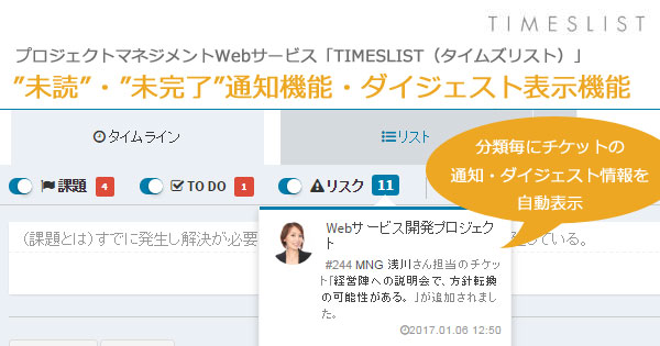 プロジェクトマネジメントを専門分野にサービスを提供する株式会社マネジメント(本社:東京都港区、代表取締役社長:音羽真東)は、みんなの課題解決力を上げるプロジェクトマネジメントWebサービス「TIMESLIST(タイムズリスト)」に、課題・TO DO・リスクの分類毎された“未読”・“未完了”が一目でわかる最新チケット状況の通知機能、それぞれの通知内容を簡易確認できるダイジェスト表示機能を2017年1月9日より提供開始しました。