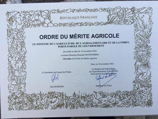 渋谷区神宮前にある、レストランKEISUKEMATSUSHIMAオーナーシェフ 株式会社ACCELAIRE 代表取締役 松嶋啓介が、フランス農産物・食文化普及への功績により、2016年12月下旬フランス政府より勲章を授与されましたことをご報告申し上げます。