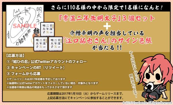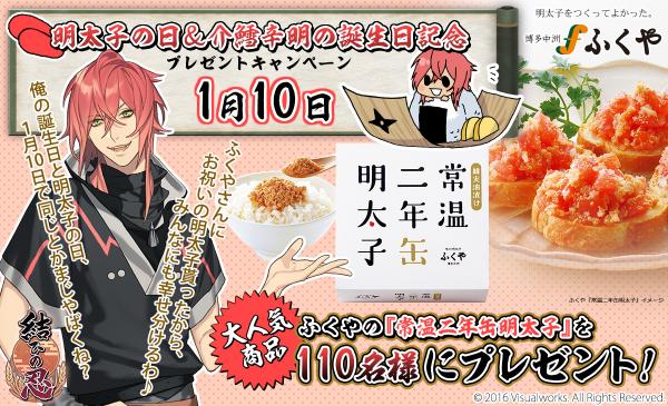 現在、事前登録を受け付け中の新作カード式シナリオゲーム『結ひの忍』に登場するメインキャラクター、明太子「介鱈辛明」の1月10日の誕生日を記念して、同じく1月10日(昭和24年)に辛子明太子を日本ではじめて製造・販売したふくや様より人気商品『常温二年缶明太子』をご提供いただきました。お福分けとして、110名様にプレゼントするキャンペーンを開始いたします。