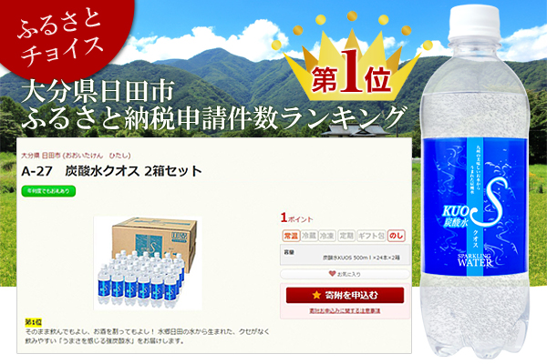 株式会社OTOGINO(オトギノ:社長 鬼武公洋 本社 大分県日田市北友田 2 丁目 2123 番地 1)がE-コマースにて販売中の、大分県日田市のふるさと納税のお礼の品としてご使用いただいているうまさを感じる強炭酸水『KUOS-クオス-』が、ふるさと納税総合サイト「ふるさとチョイス」にて、大分県日田市のH28年度申請件数ランキングで1位に選ばれました。
