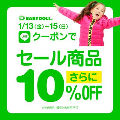 BABYDOLL LINE@友だちを対象に、セール商品がさらに10%OFFになるお得なLINEクーポンをプレゼントします。通販限定のアウトレットも対象です!