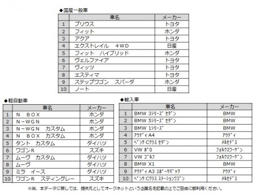 情報流通支援サービスの株式会社オークネット(本社:東京都港区/社長:藤崎清孝)は、2016年12月度のTVオートオークション(TVAA)における成約台数を集計し、タイプ別ランキングベスト10をまとめました。