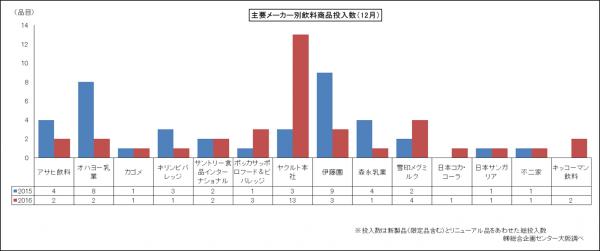 ■弊社が継続して調査している飲料新製品の発売状況を見ると、2016年12月では主要メーカー21社のうち14社が商品を投入。これらの商品投入数の合計は37品目となり、前年同時期比で2品目減となっている。メーカー別では、ヤクルト本社の13品目が最も多い。以下、雪印メグミルク(4品目)、伊藤園とポッカサッポロフード&ビバレッジ(各3品目)、アサヒ飲料、オハヨー乳業、サントリー食品インターナショナル、キッコーマン飲料(各2品目)などが続く。