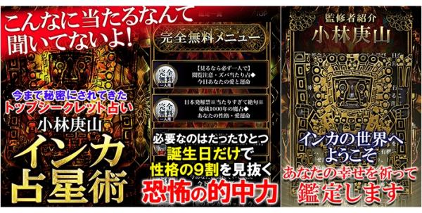 2010年のリリースよりアプリエンタメ1位、LINE占いなどで現在でも1位を獲得し続ける鑑定士「小林庚山」。一切世に出ず、顔も出さず、特定の人のみしか鑑定を行わない、本当のレア鑑定がついにベールを脱ぎます。インカ占星術という特別で画期的な鑑定法はあなた自身の性格を見抜きだします。その的中力は9割見抜くと呼ばれるほど。恐ろしいほど見抜かれると話題沸騰中の鑑定。その奇跡の力にあなたも触れてください。