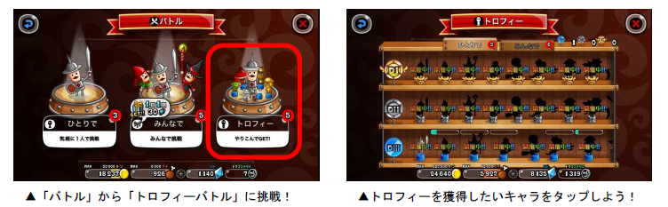 「トロフィーバトル」は、各キャラのトロフィー獲得を目指して、全国のプレイヤーとバトルを行ないます。