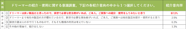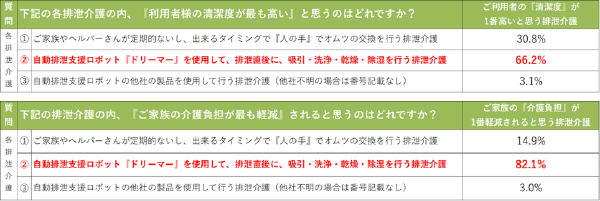 ■調査項目 :今後需要が高まる介護ロボットに関して、実際に拝見していただき、ケアマネージャーの方の感想・ご意見をまとめております。今回は実際にデモンストレーションが可能な排泄介護ロボット『ドリーマー』を持ち込んで調査を実施しました。(1)排泄介護の面で介護ロボットと人の手の介護を比較していただき、ご利用者様の清潔度維持、ご家族の方の介護負担軽減に関して、最も優れていると感じられるのはどちらかのアンケート調査を致しました。(2)介護ロボット『ドリーマー』のご利用者様、ご家族へのご紹介意向を調査致しました。