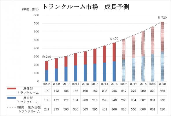トランクルーム市場は、近年のメディア露出の増加・サービス認知度の向上とともに市場規模は拡大の一途を辿り、店舗数は市場全体で全国7,300店舗に達し、ファミリーレストランの店舗数(約9,000店舗)に匹敵する規模へと大きく拡大しました。延べ室数は34万室を超え、約470億円の市場規模へと飛躍的な成長を続けています。現在の市場拡大が続くと仮定した場合、東京オリンピックが開催される2020年には700億円を超える市場へと成長する可能性を秘めています。