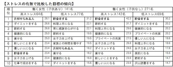 調査の結果、働く女性に共通する目標は「貯金」であり、ワーキングマザーは「片付けられる人」を目標に掲げる割合が高いことがわかりました。