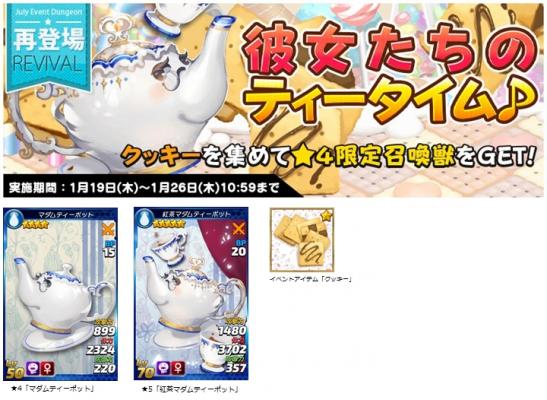 また、期間中イベントステージクリアで獲得可能なイベントアイテム「クッキー」を集めると、交換所で★4限定召喚獣「マダムティーポット」や進化素材、復活石などと交換できます。
